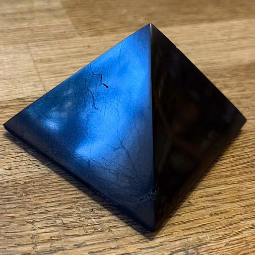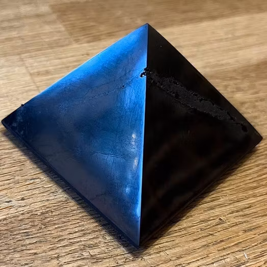 En polerad shungitpyramid har en slät yta som reflekterar ljus. Kan med fördel placeras nära dator, mobil eller TV och blir även en vacker (och nyttig) inredningsdetalj.