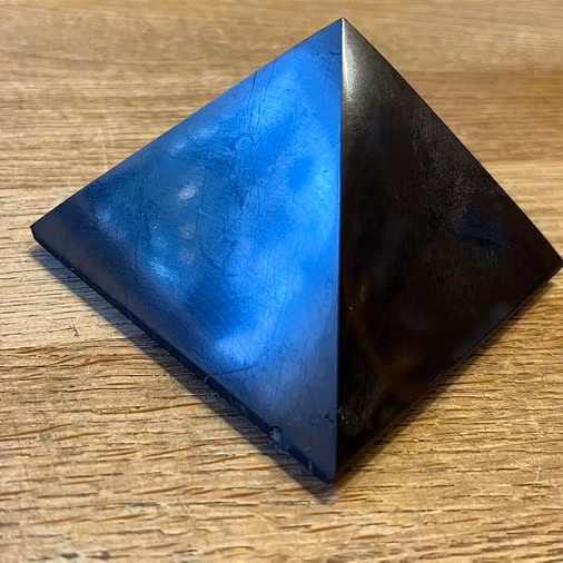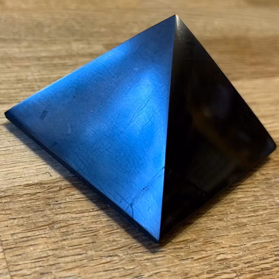 En polerad shungitpyramid har en slät yta som reflekterar ljus. Kan med fördel placeras nära dator, mobil eller TV och blir även en vacker (och nyttig) inredningsdetalj.