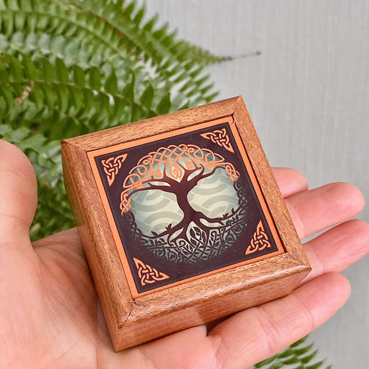 En ask med vackert Tre Of Life på locket.