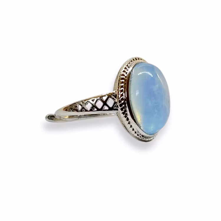 En ställbar ring med infattad Akvamarin från Brasielien, ringen är av legerad koppar. Välj modell i rullmenyn.