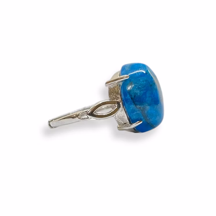 En ställbar ring med infattad blå Apatit från Brasilien, ringen är av legerad koppar. Välj modell i rullmenyn.
