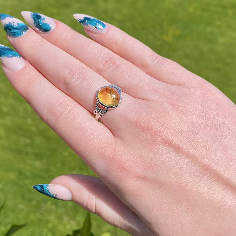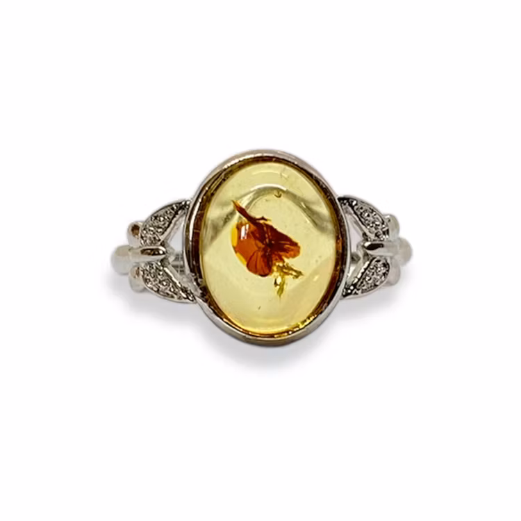 En ställbar ring med infattad Bärnsten från Kina, ringen är av legerad koppar.