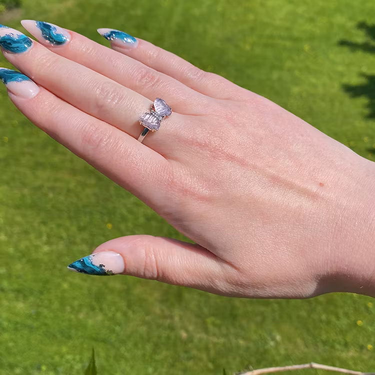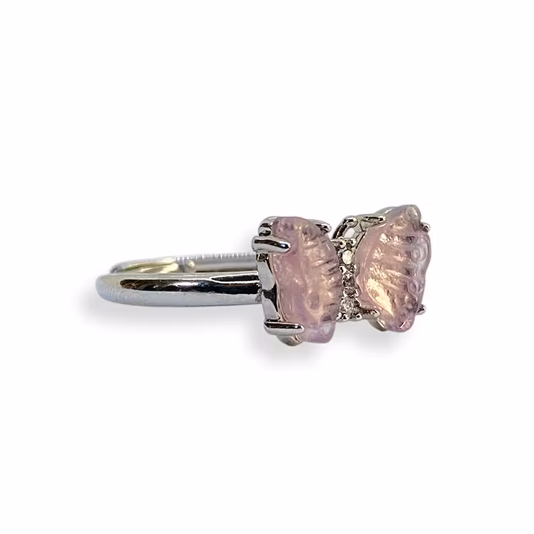 En ställbar ring med infattad form av en fjäril i Fluorit från Kina, ringen är av legerad koppar. Välj färg i rullmenyn.