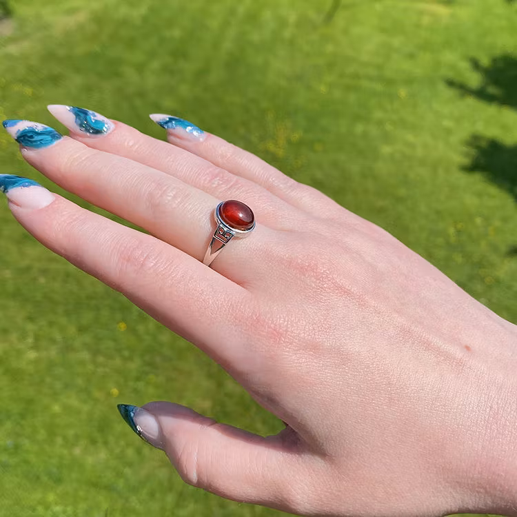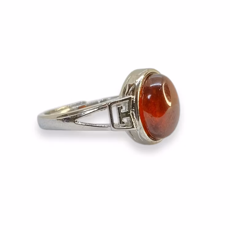 En ställbar ring med infattad Granat från Kina, ringen är av legerad koppar. Välj modell i rullmenyn.